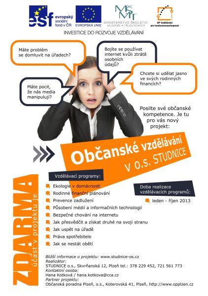 Občanské sdružení ENVIC se podílí přípravou a vedením kurzu „Ekologie v domácnosti“ na projektu o.s. STUDNICE – Občanské vzdělávání v o.s. STUDNICE. Do tohoto všestranného kurzu se je již možné přihlásit. Účast je zdarma, kapacita omezena, neváhejte se tak zaregistrovat na druhý termín – 3. 6. 2013.