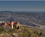 Těžba uhlí ničí krajinu. Zámek Jezeří, v pozadí uhelný velkolom ČSA (foto: www.zamek-jezeri.cz)