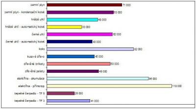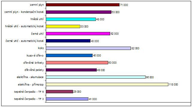 Uvedené náklady na vytápění zahrnují pouze spotřebu paliva, nikoliv energii na rozvod otopné vody, a odpovídají použití klasického staršího kotle na uhlí s účinností 55 % a ceně hnědého uhlí 2900 Kč za tunu.