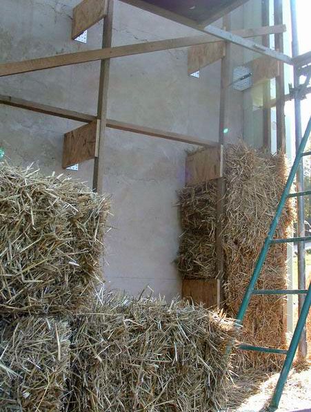 Nosná konstrukce z dřevěných sloupků, tepelná izolace ze slaměných balíků (foto: Michaela Míkovcová)