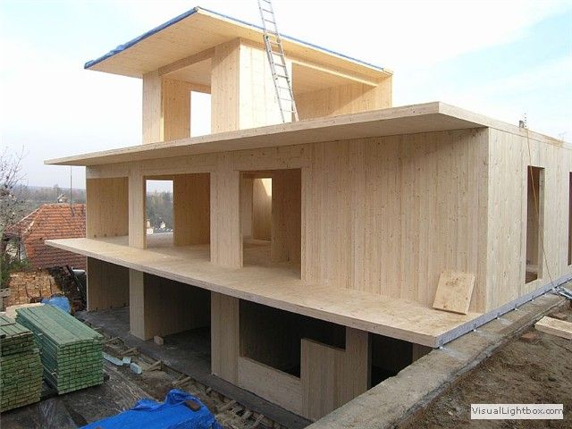 Nosná konstrukce je tvořena panely ze dřeva. Panely jsou vyráběny z prken lepených ve vrstvách na sebe. Panely jsou ořezávány do požadovaných rozměrů a přímo na stavbě je z nich skládána nosná konstrukce domu. Nosná konstrukce je z vnější strany opatřena tepelnou izolací. Materiálem nosné konstrukce jsou dřevěné panely, jako tepelnou izolaci lze použít: tuhé desky z konopí, vláken ze dřeva, rákosu, korku, minerální vlny, slaměné balíky, měkké desky (obvykle v roštu) z konopí, lnu, vláken ze dřeva, minerální vlny, výplň z drcené celulózy. Měkká izolace je doplněna provětrávanou mezerou nebo difúzně propustným záklopem.