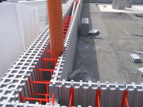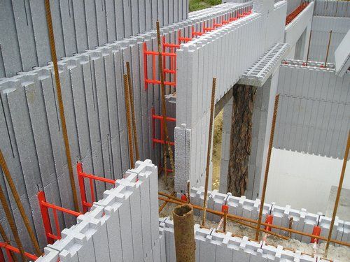 Ztracené bednění z polystyrenu s plastovými spojkami (červené). Do mezery kde jsou spojky bude nalit beton (foto: Asting CZ).